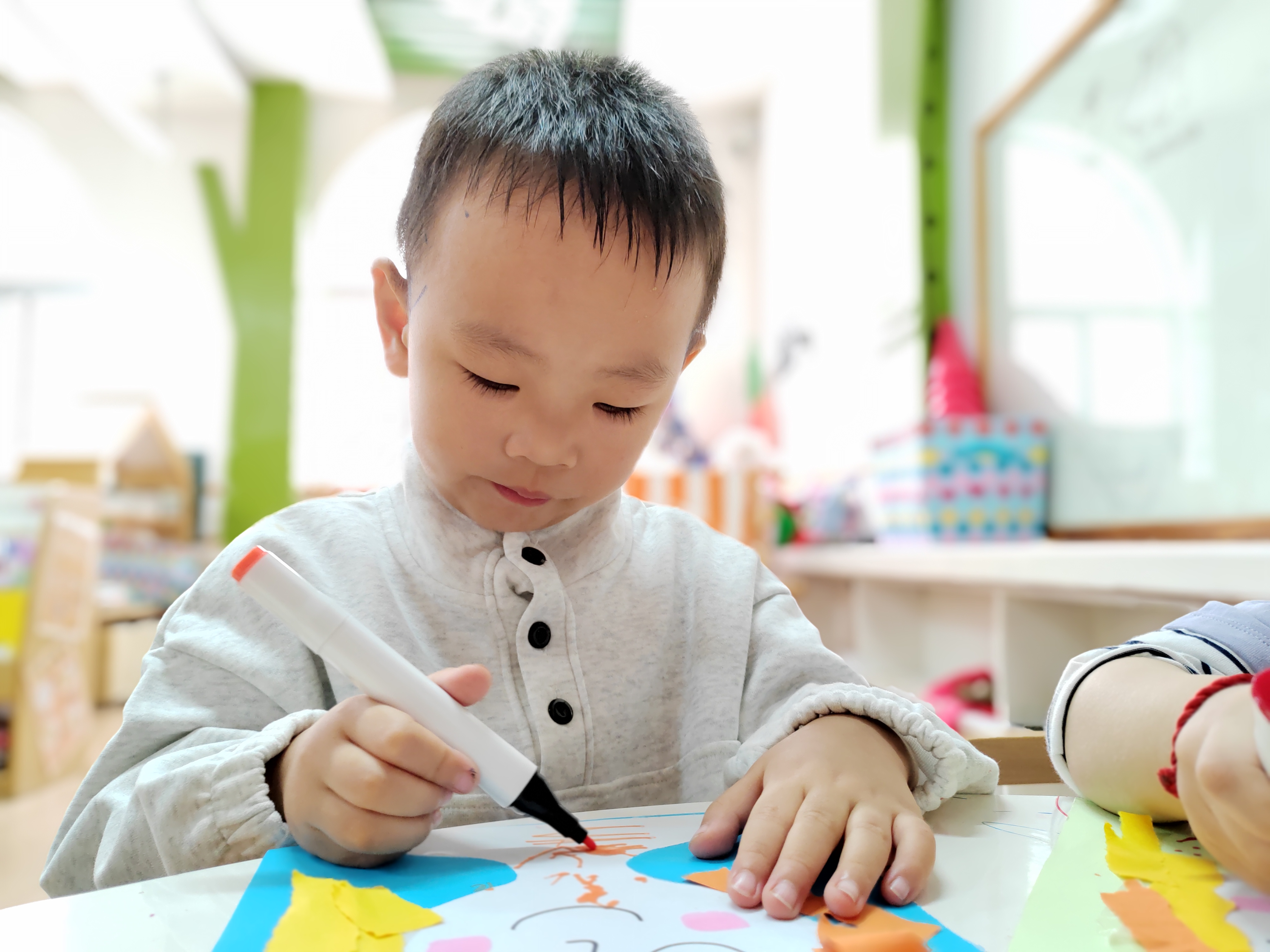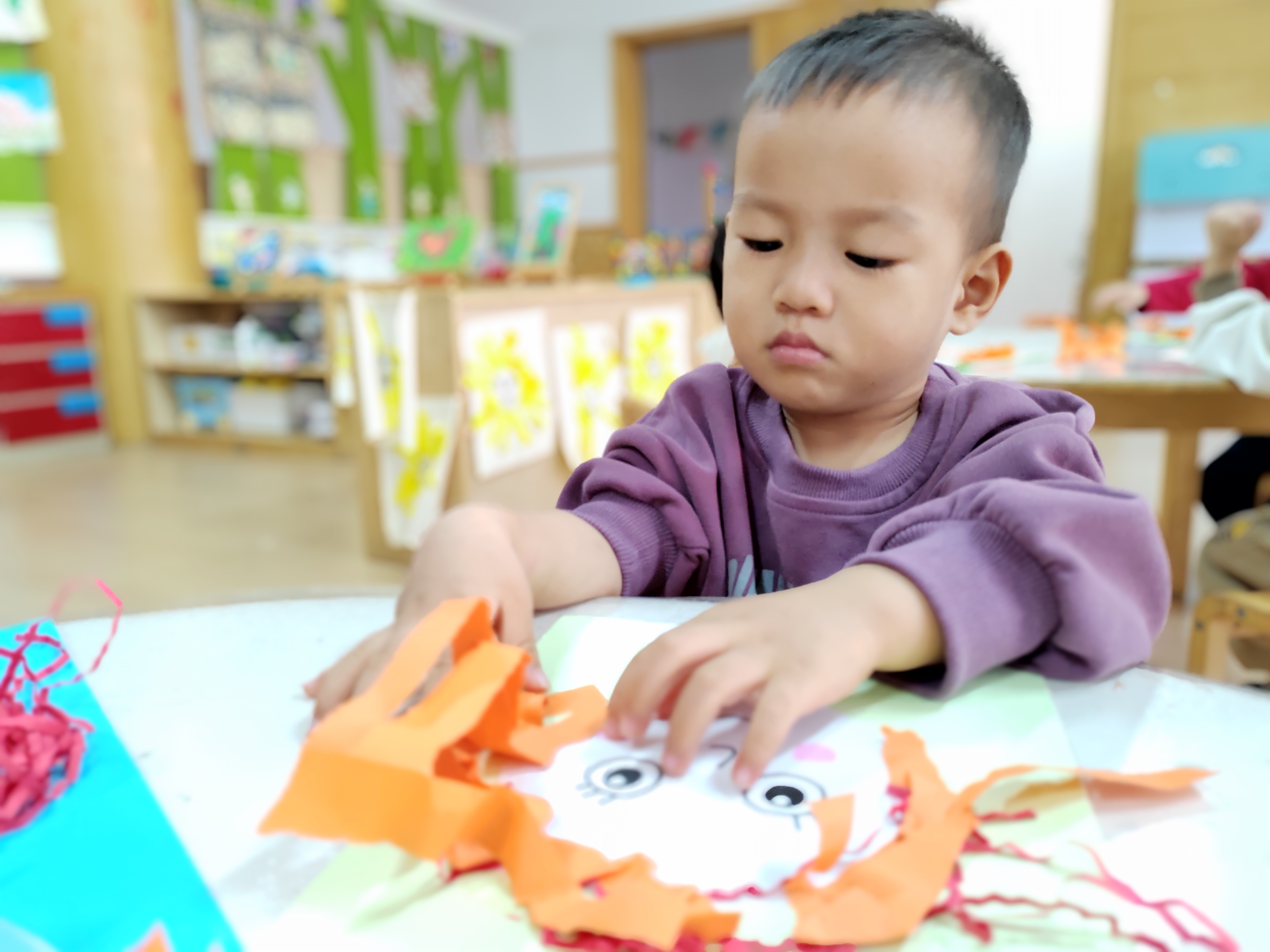 幼儿自由选择皱纹纸、彩色纸等作为头发,有的幼儿利用礼盒里面的碎纸片来装饰妈妈的头发,既环保又有创意!